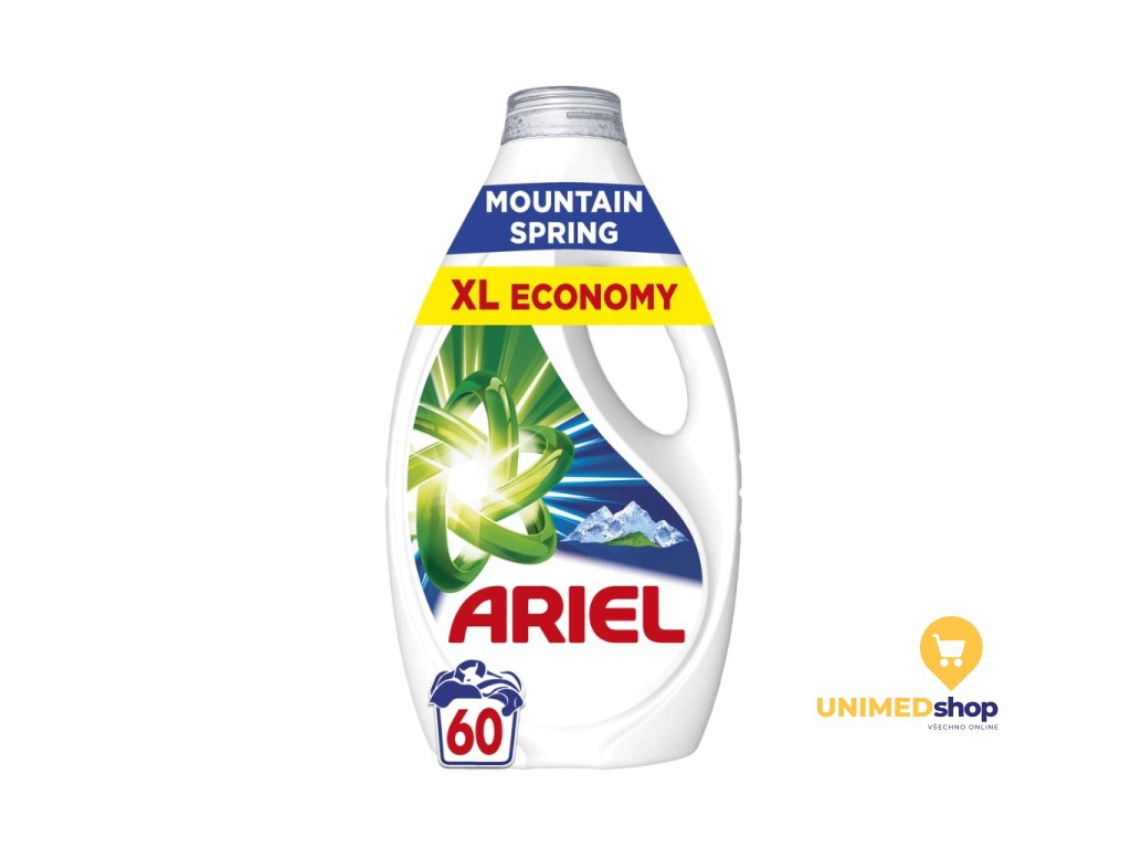 Ariel Mountain Spring je vysoce účinný tekutý prací gel určený pro bílé a světlé prádlo, který si poradí i s odolnými skvrnami a nepříjemným zápachem – a to už při teplotě od 30 °C. Díky inovativnímu složení působí již během praní, zanechává prádlo hygienicky čisté, svěží a provoněné vůní horského pramene. Je vhodný pro krátké prací cykly a lze jej aplikovat přímo na skvrny pomocí odměrky.