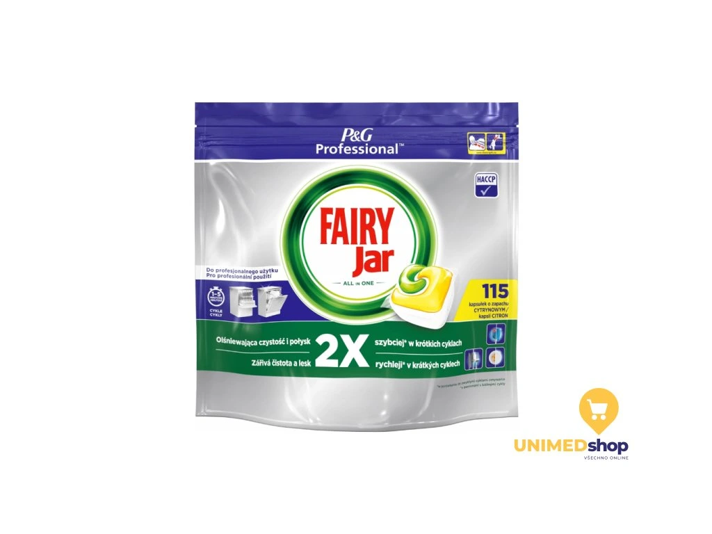 Profesionální tablety do myčky JAR / FAIRY All in One kombinují mycí gel i prášek, funkci soli, ochranu skla a kovového lesku nádobí, čistič myčky a prevenci vodního kamene – vše v jednom. Díky tekutým odmašťovacím látkám účinně odstraňují i odolné skvrny, zanechávají nádobí zářivě čisté a lesklé.