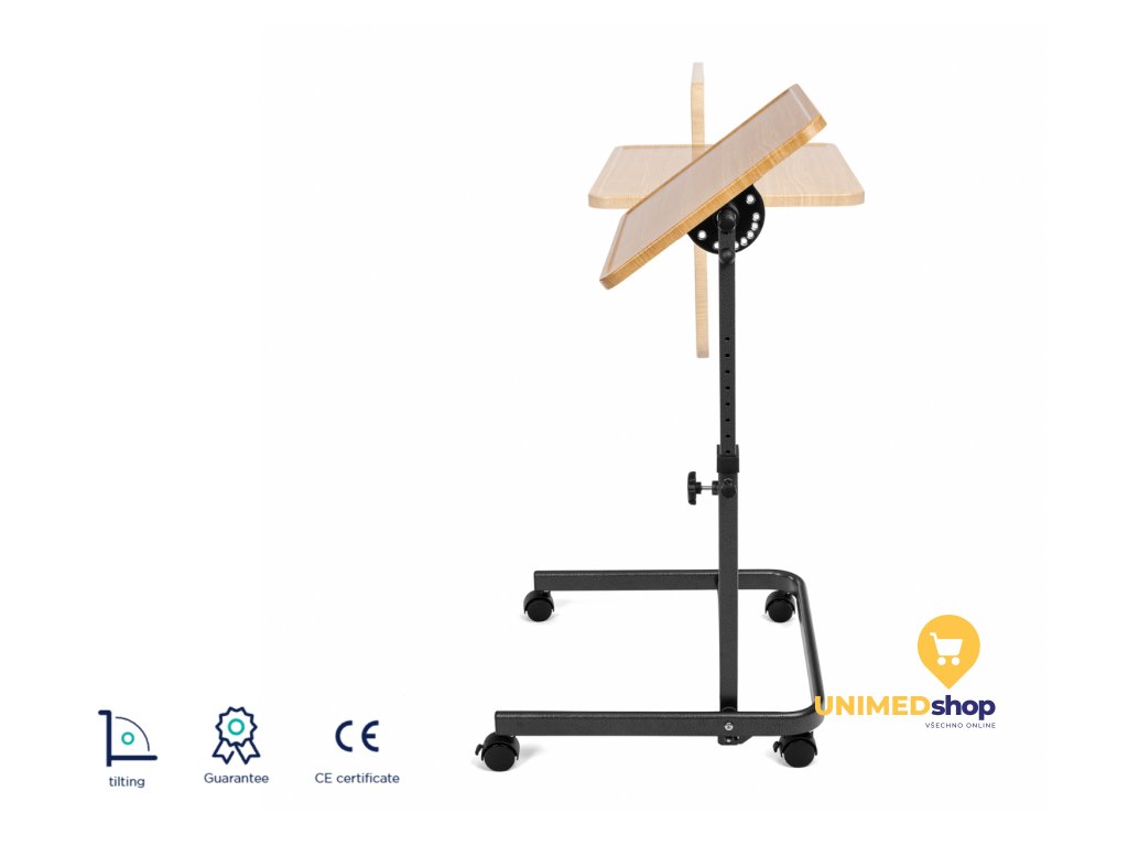 Kovová konstrukce ve tvaru „C“ umožňuje snadné zasunutí pod postel a pohodlný pohyb nad lůžkem. Stolek je vybaven nastavitelnou výškou i sklonem desky, takže se přizpůsobí individuálním potřebám uživatele. Otočná kolečka s brzdou zajišťují bezpečnou manipulaci.