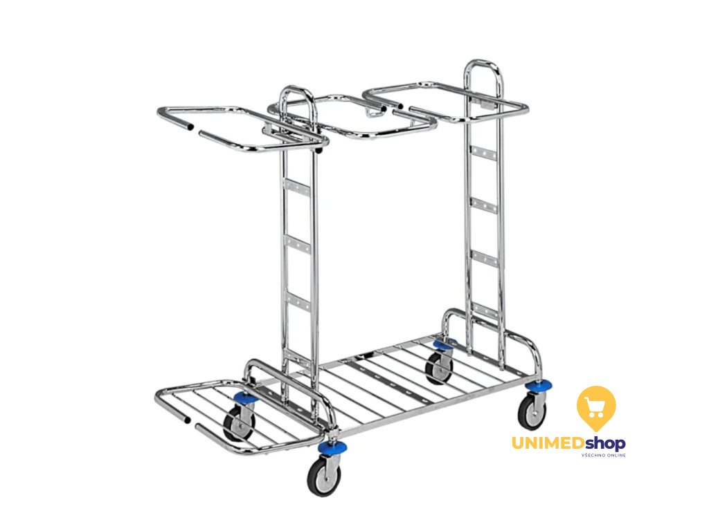 Každý držák je vybaven sponami pro pevné uchycení pytlů, spodním roštem a možností doplnění o barevné víko (červené, modré, zelené, žluté, šedé) pro zónování dle HACCP. Konstrukce je tvořena pochromovaným kovovým rámem s otočnými kolečky o průměru 100 mm, které zajišťují snadnou manipulaci i při plném zatížení.